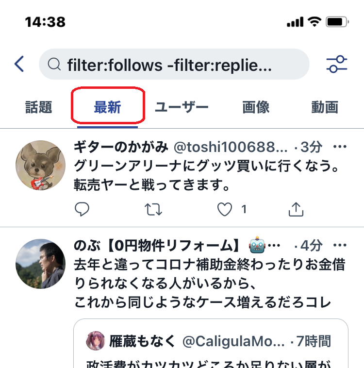 これで検索すると、ホームにはフォロワーの発信でリプライとリツイートを除いたものだけが表示されます。左から2番目の『最新』をタップします。