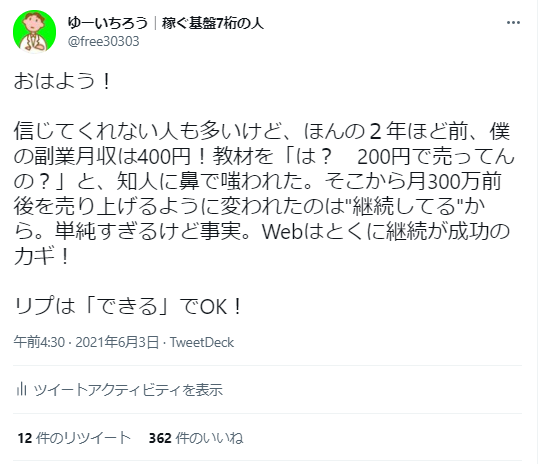 できればはやめに収益化の行動をとっていくと、Twitterが楽しくなりますし、時間をかける意義も出てきます。